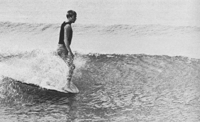Peter Goodwin was possibly the first local surfer to interpret the messages filtering in from California and Australia. John Logan says: “Goody was the first of us to start moving his board around the wave, perfecting what was then called ‘hot-dogging’.”
