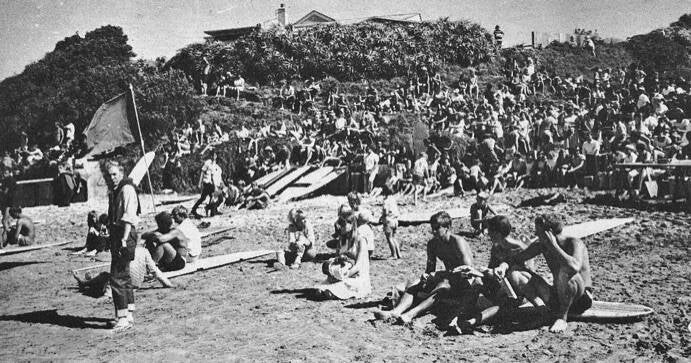 and Terry Byrne during an early surfing contest at Midway Beach.