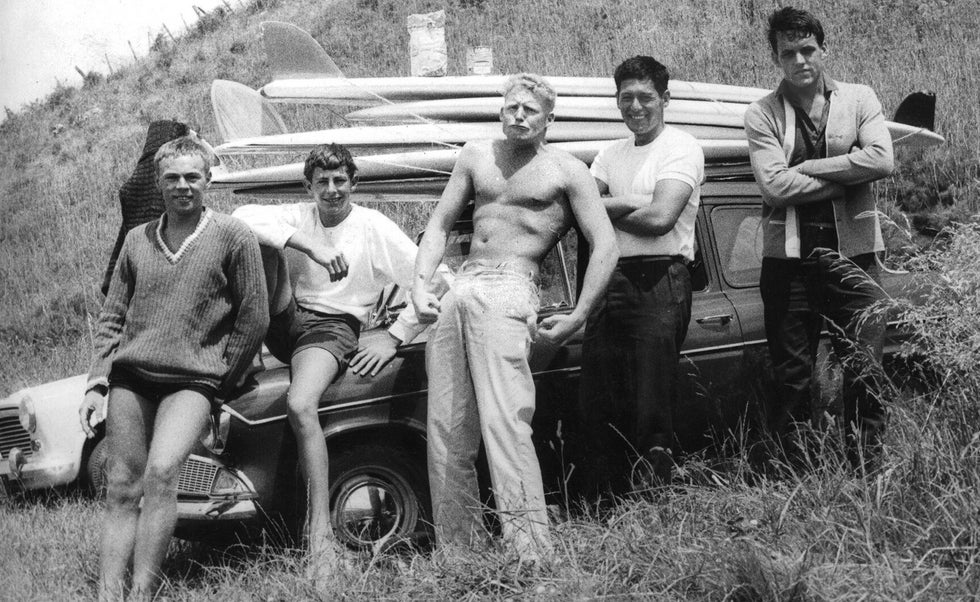 John Logan, Peter Goodwin, Darryl Heighway, David Swann and Kevin Pritchard with the boards stacked on John’s Ford Anglia in 1962.