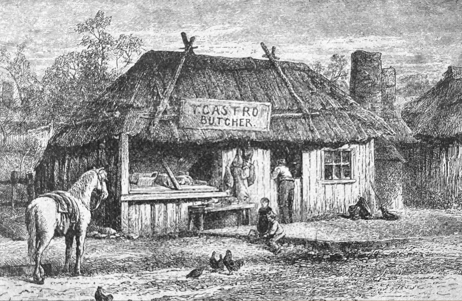 An engraving of the butcher shop owned by Thomas Castro in Wagga Wagga, Australia, during the Victorian era. The butcher, also known as Arthur Orton, claimed to be Sir Roger Tichborne, the missing heir to a prominent English baronetcy.