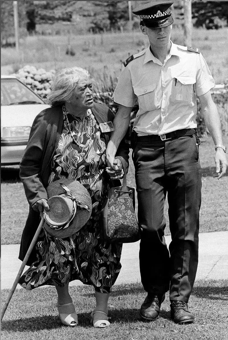 On this occasion I was later commended for my sensitive eye after taking this image of Police Constable Nigel Hendricks assisting a frail old kuia at a major political hui at Te Araroa in the 1980s. I later got to know Hendricks well after he was savagely attack with a screw driver and maimed for life by the notorious criminal John Gillies in 1993.