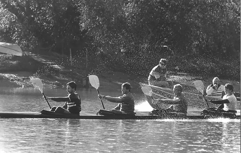 I took this image of the Olympic K4 team training on the Waimata River in Gisborne in 1984. They went on to win gold medals. From left— Alan Thompson, Ian Ferguson, Paul Macdonald and Grant Bramwell with Ben Hutchings in the coach boat.