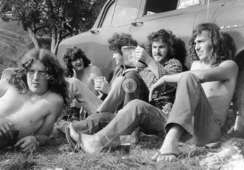 My friends (from left) Ashley White, Allan Hill, Paul and Terry Downey and Basil Mann at the Tatapouri Hotel carpark ion the summer of 1972 . That's my 1958 FE Holden they're leaning against.