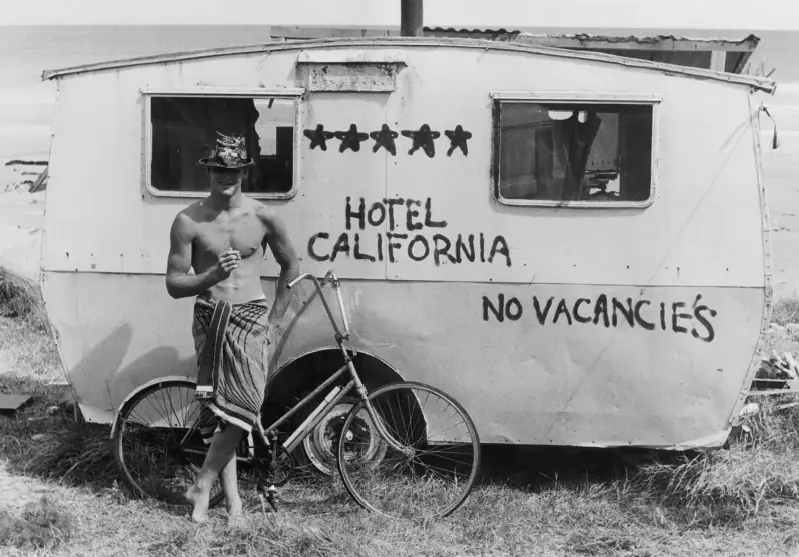 Welcome to the Hotel California. Local Vance Gilgren poses for me outside Owen Williams caravan parked up on the Makorori beachfront in the summer of 1985.