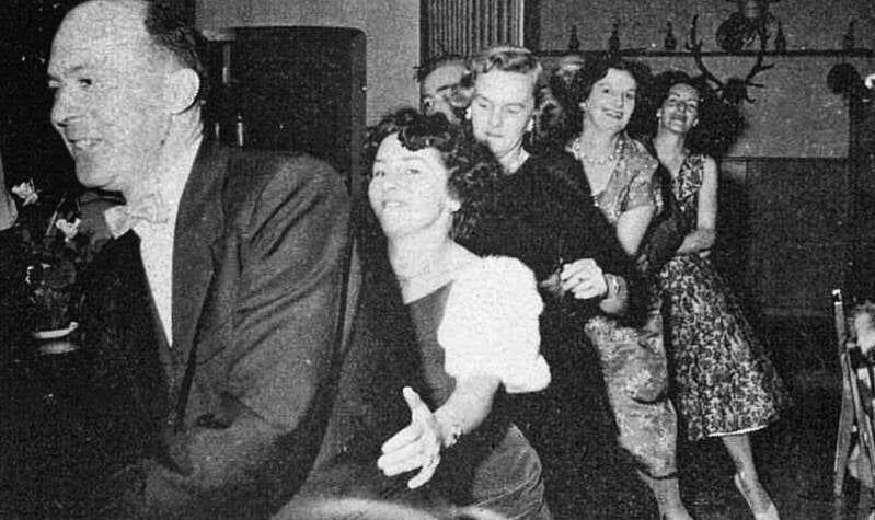 Lionel Neil is pictured at the piano, Owen Houlahan on the drums and guest vocalist Christine King “providing pleasing entertainment”. A photograph of a laughing line of pleasure-seekers carries the caption: “Custom at the Rendezvous demands that during the course of the evening, all present should take part in “La Conga”, an act in which all line up and dance single file over the dance floor, around the tables, and even through the kitchen.” On this particular night it “was discovered that Lesley Dunn and Jon Overbye were celebrating their newly-announced engagement and were toasted by all present.”
