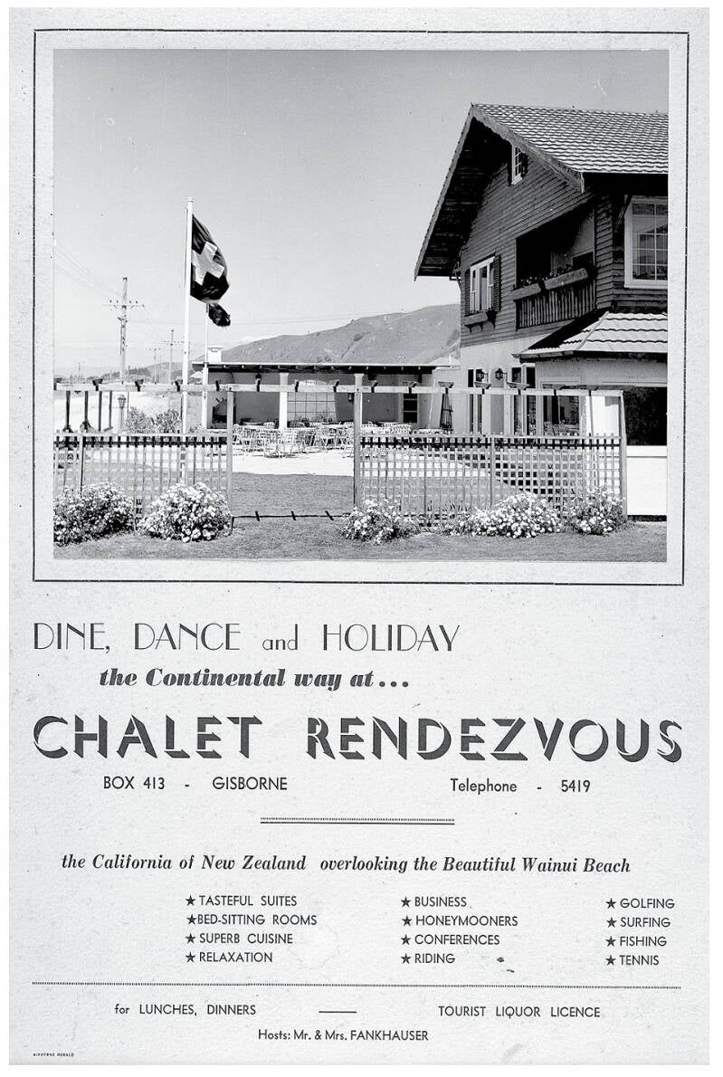 The Chalet was open for business from Christmas of 1957 and it quickly caught the public imagination. In 1958 Photo News was moved to write: “In the list of facilities and attractions which Gisborne can offer to the outside world, the Chalet Rendezvous at Wainui Beach, occupies a unique position. Set by the sea, backed by the hills, endowed with a beautiful building, luxurious guest quarters and a cuisine second to none, it is earning for itself a high reputation with visitors, many of whom have been from overseas. The Chalet is a dream come true for Mrs and Mrs C. Fankhauser whose efficient and hospitable management is not the least admirable feature of this unusual holiday resort. They have set out to create and have achieved something which blends the characteristics of their homeland, Switzerland, with the land of their adoption, New Zealand. This applies not only to the architecture of the buildings and its interior decoration, but also to the cuisine.”