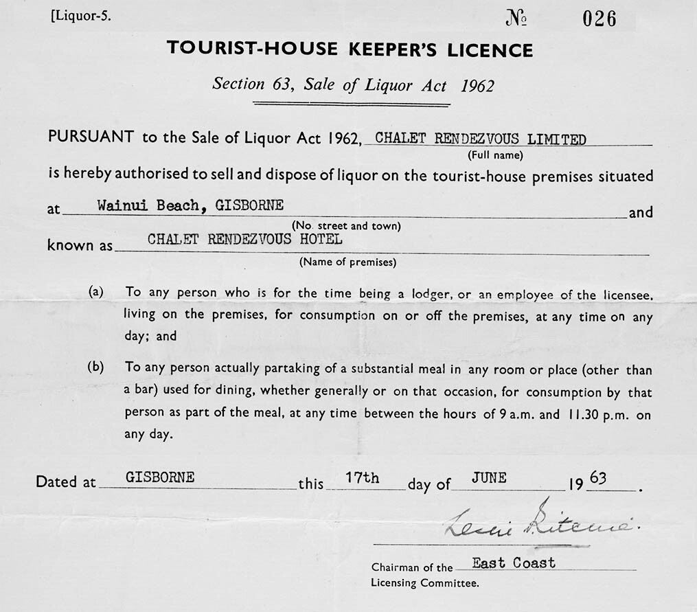 So the Chalet Rendezvous at Wainui Beach may not have technically been the first restaurant to obtain a Restaurant License, but it’s almost certain it was the “first restaurant in New Zealand to have a licence to serve liquor”, beating the celebrated Mr Groen to a celebratory round of drinks at the bar by four years.