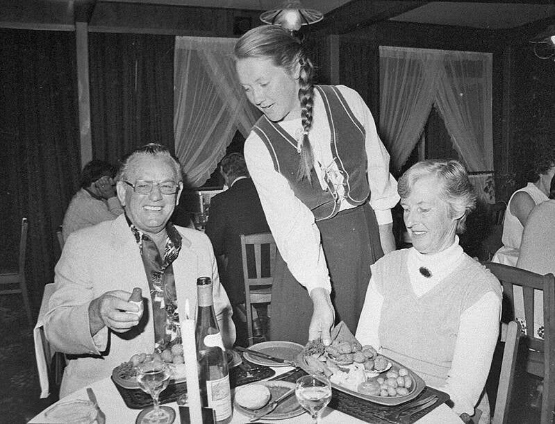 Waitress Megan Johnstone dressed in her traditional Swiss waitress outfit in the early 1980s.
